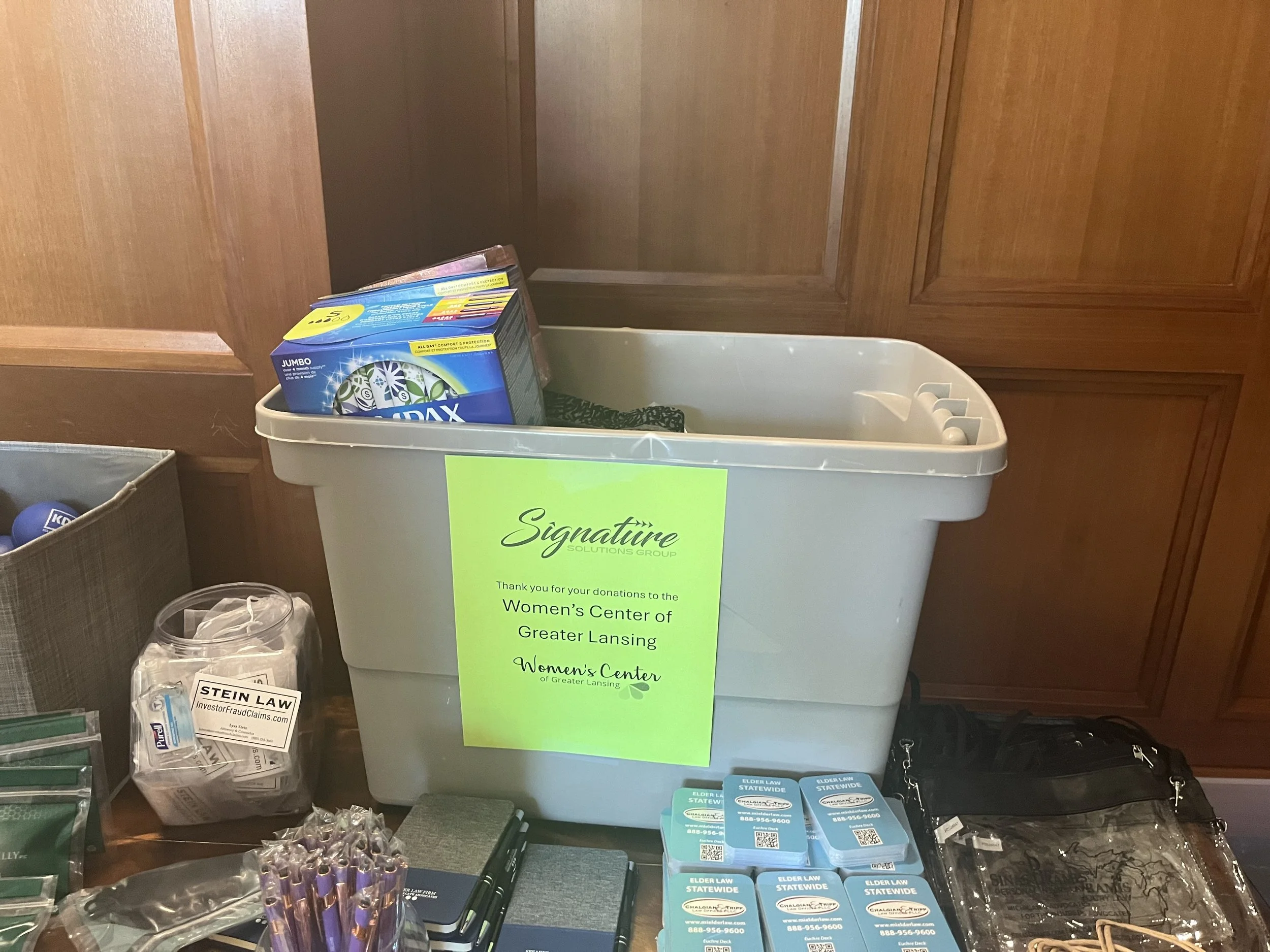 Jenna and Erika represented the group at the WLAM Annual Meeting, where they sponsored and conducted a clothing drive for their partners The Women’s Center of Greater Lansing.